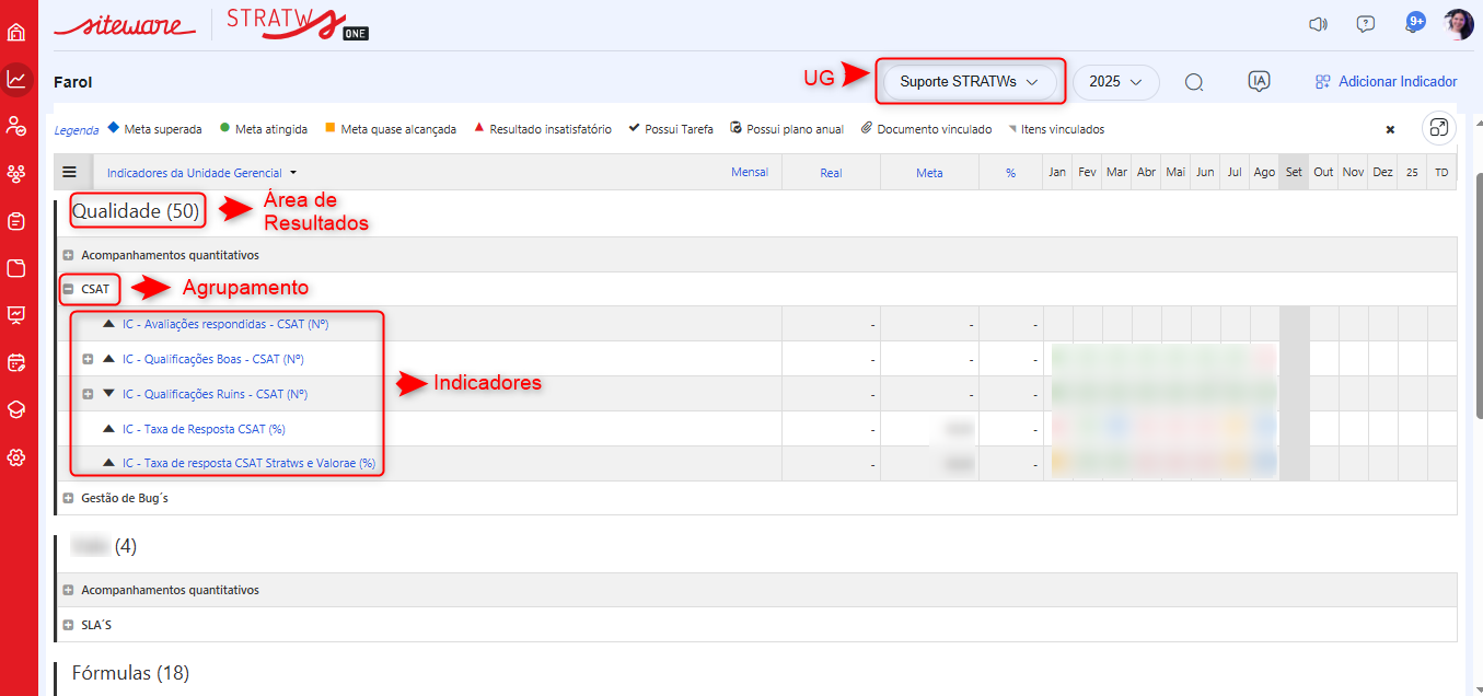 Na UG Suporte Stratws, dentro da área de resultados Qualidade, criamos um agrupamento chamado CSAT. Nele concentramos todos os indicadores de satisfação, como CSAT, Taxa de Resposta e outros relacionados. Assim, a equipe acompanha tudo de forma mais clara e ágil.