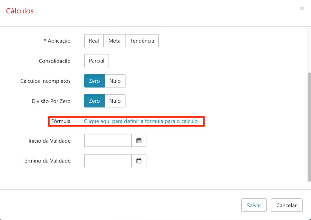 A opção de Consolidação Parcial serve para consolidar o valor do Real do indicador parcialmente. Ou seja, caso os itens da fórmula não tiverem valor ou o mês ainda não estiver fechado, ele fará a consolidação mesmo assim. Se não for marcada, apenas os meses já fechados terão seus valores do Real consolidados.
