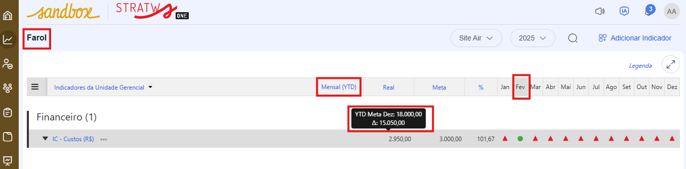 Além de acompanhar o YTD do mês selecionado, você consegue enxergar com mais transparência a referência da meta anual e a diferença do Real até ela.