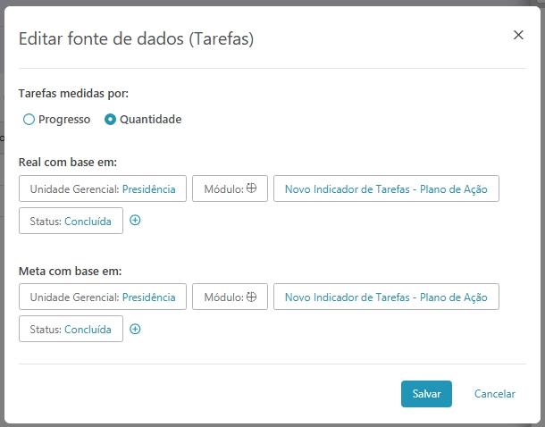 Com o novo comportamento, configurando o indicador para que o filtro considere tarefas com status concluído na meta e real, apenas essas datas finais previstas são consideradas no indicador, refletindo corretamente os valores de meta e realizado, conforme mostrado na imagem.