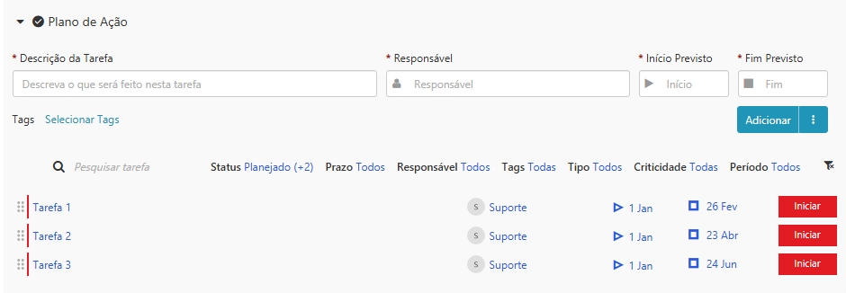 Neste exemplo, temos 3 tarefas iniciadas em janeiro, cada uma com uma data de finalização prevista diferente: fevereiro, abril e junho.
