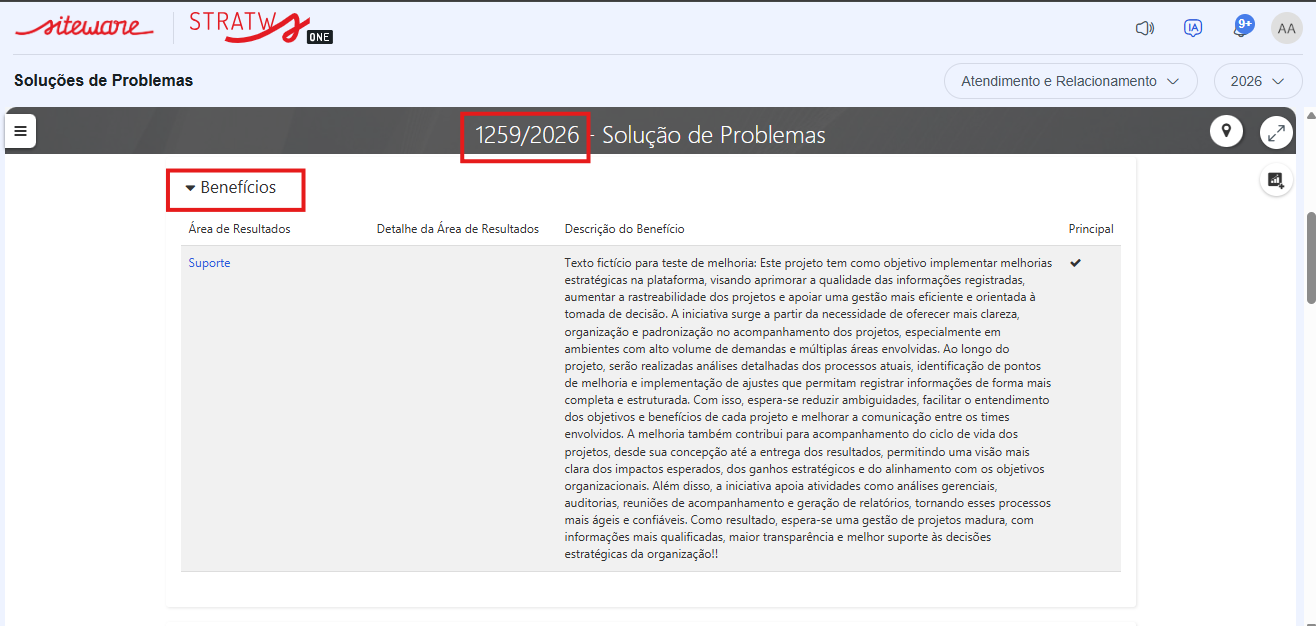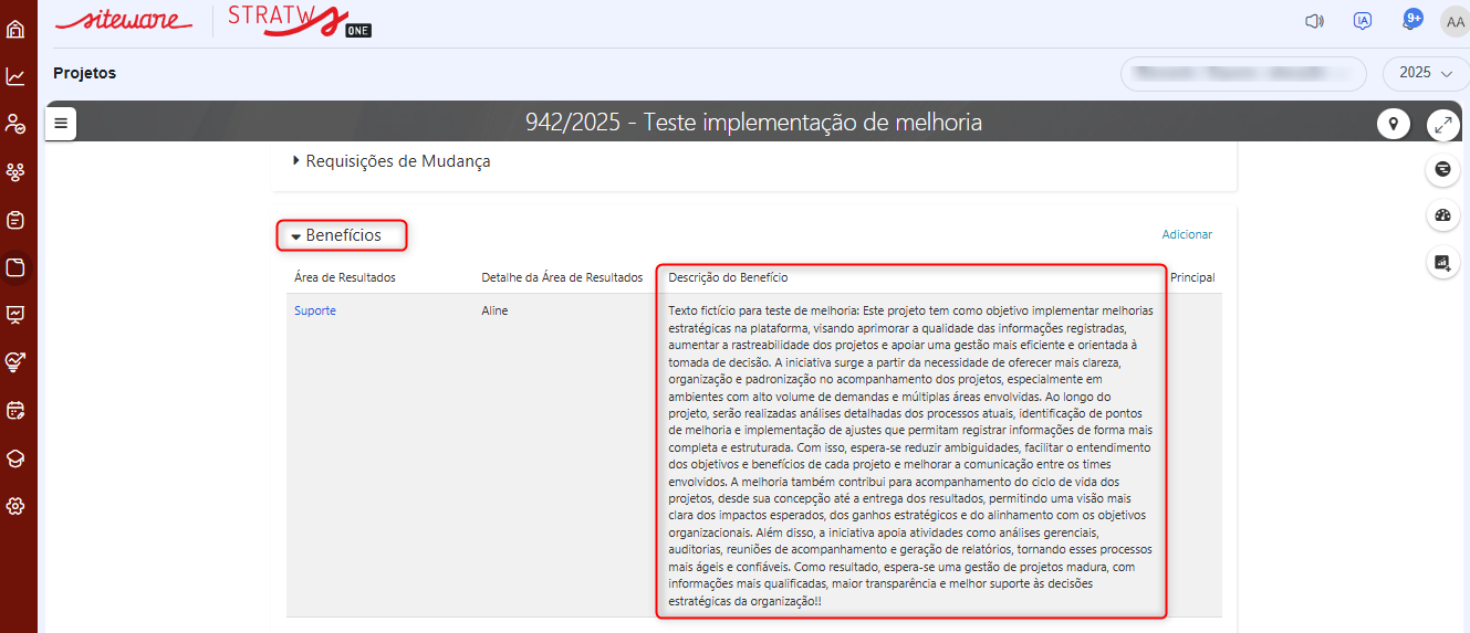 O aumento do número de caracteres no campo Benefícios dos projetos permite descrever de forma mais clara e completa os ganhos obtidos pela empresa com a execução de cada projeto. Antes, a limitação de espaço dificultava o registro adequado desses benefícios, deixando a descrição bastante restrita devido ao número máximo de caracteres permitido. Agradecemos à Siteware pela implementação dessa melhoria!