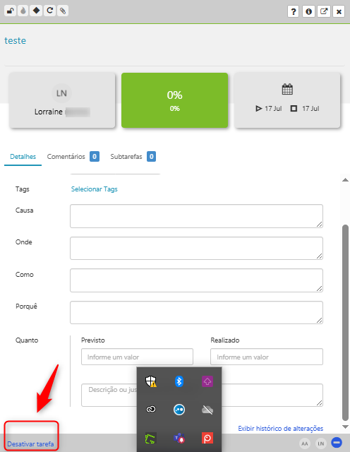 Acredito que esteja se referindo a “Projeto” = Soluções de Problemas. O Stratws permite a desativação da tarefa. Ao clicar sobre ela, caso seu usuário tenha permissão será exibido o botão “Desativar tarefa”.
